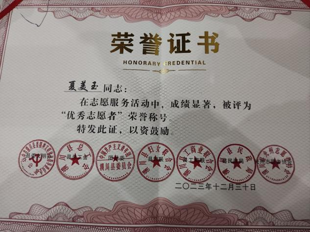 22级学前2班夏美玉同学在寒假期间参加横川县光州志愿者服务工作,并积极参与了关爱户外劳动者活动,为环卫工人打热水、盛早饭等,被评为“优秀志愿者”荣誉称号并获得相关荣誉证书。