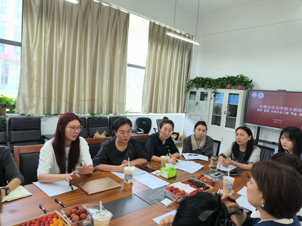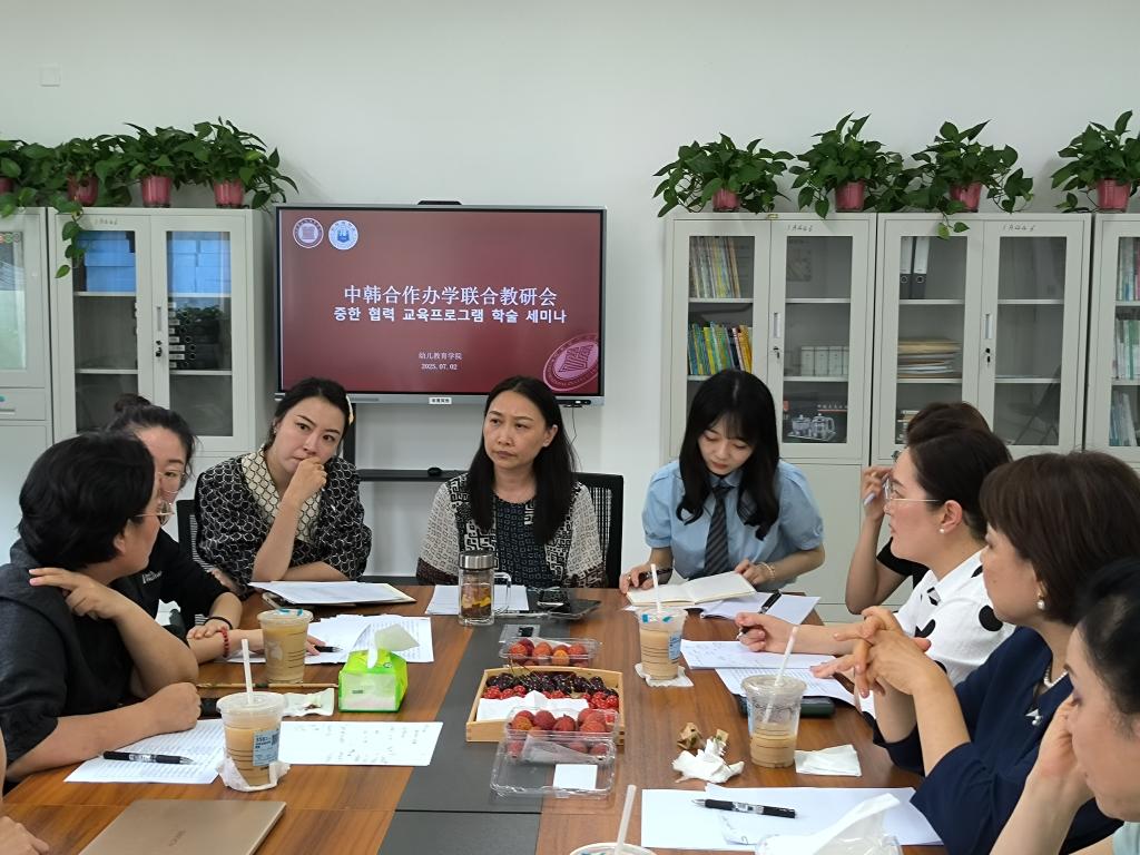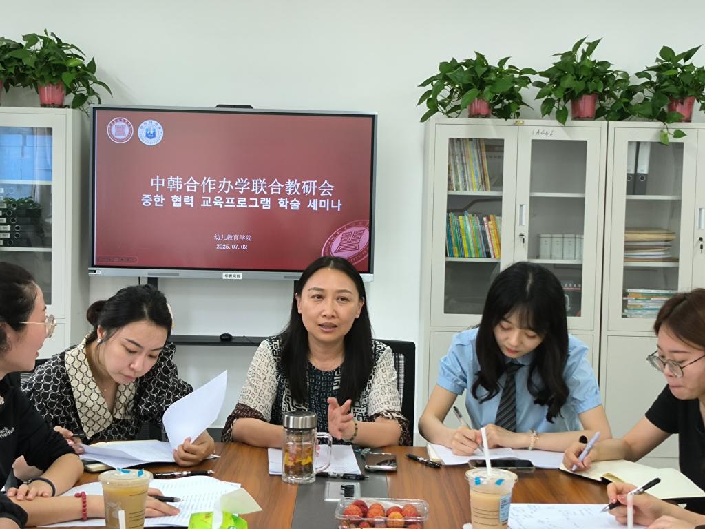 为深化中韩合作办学内涵,提升学前教育专业人才培养质量,必一运动官网于2025年7月2日下午16:00,在2C179会议室举办“中韩合作办学联合教研会”。韩国仁荷大学金彗羅教授、姜順美教授、金京玧教授与必一运动官网经理李海英、副经理崔颖及教师代表齐聚一堂,围绕课程建设与教学协作展开深入交流。