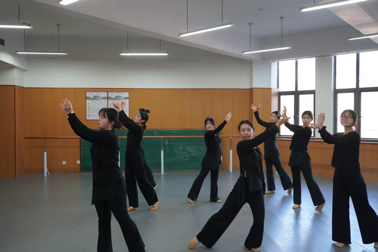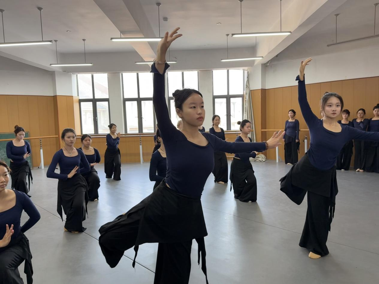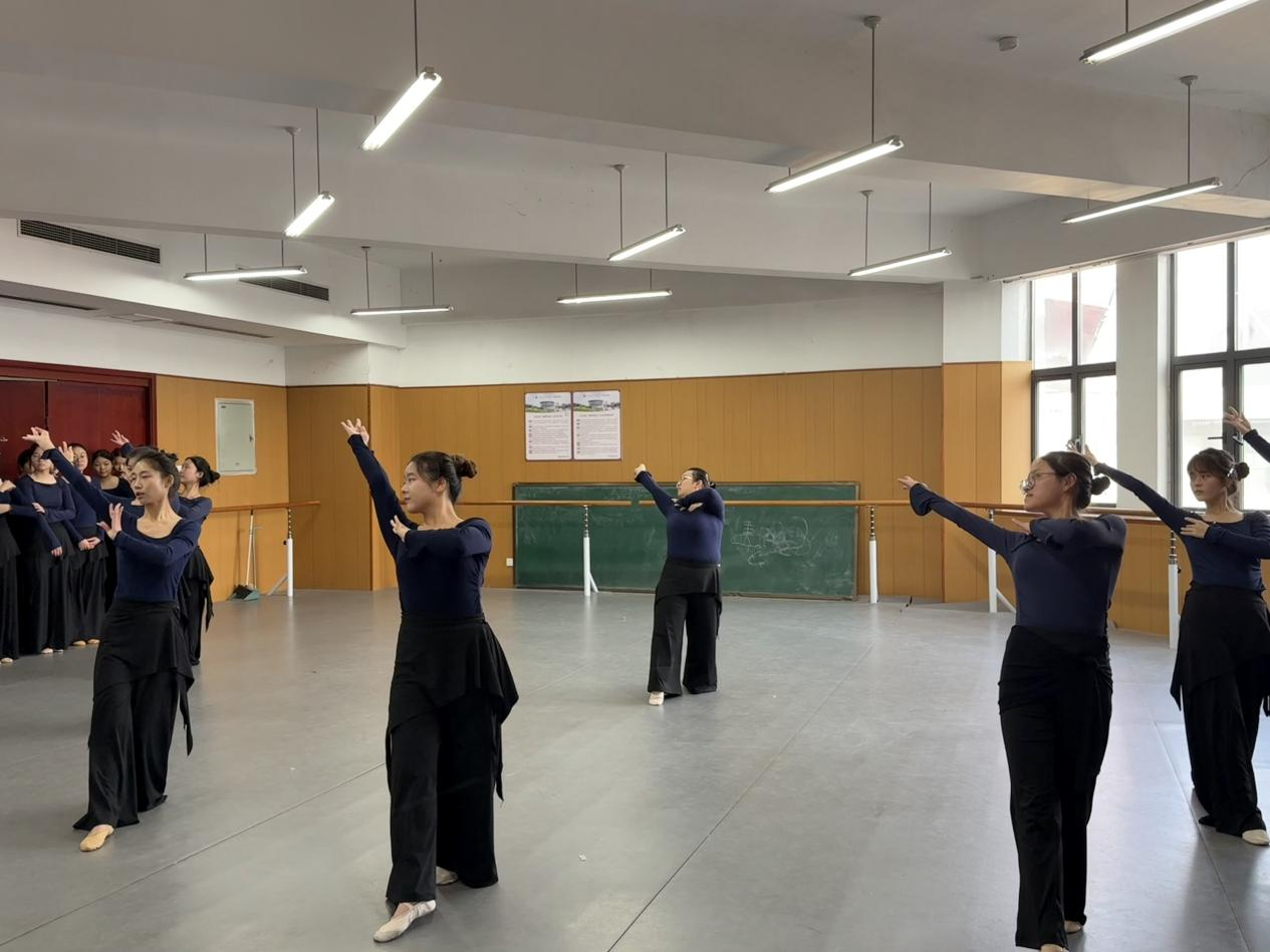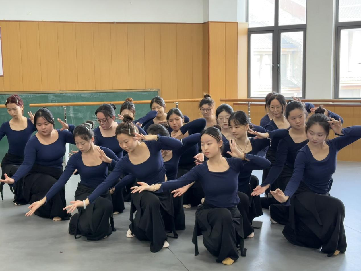 展演在古典舞基训考核中拉开序幕。同学们气韵连贯、动作规范,于一招一式中初显古典舞的含蓄与张力,扎实的身体控制与韵律把握,充分展现了课程在形体塑造与气质培养上的扎实成效。