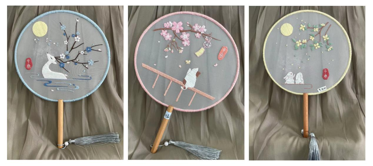 团扇起源于中国,又称宫扇、纨扇,是中国汉族传统工艺品及艺术品,是一种圆形有柄的扇子,它代表着团圆友善、吉祥如意。同学们在绣制扇面的过程中,更增加了对传统文化的喜爱。