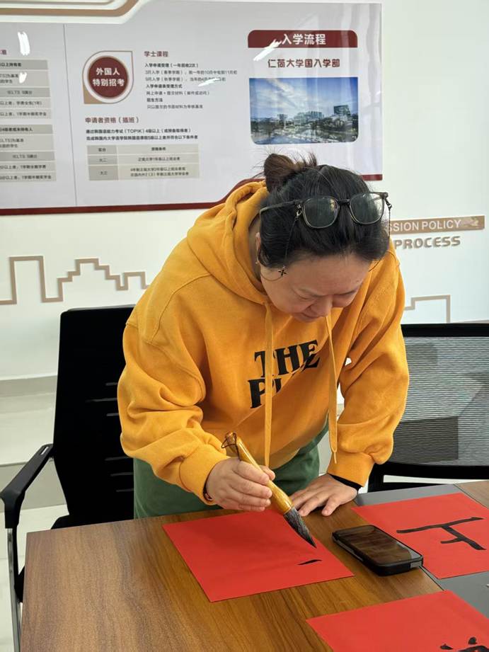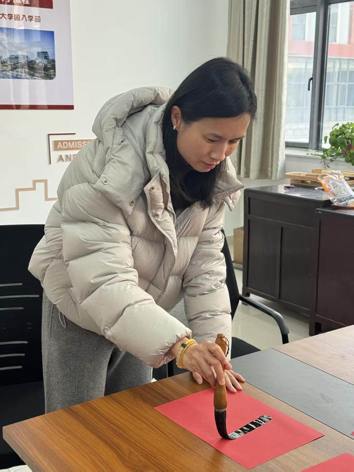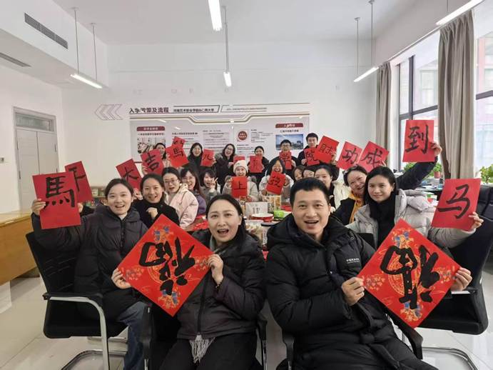 联欢会现场热闹非凡,上午狼人杀思维交锋、笑语不断;掼蛋搭档切磋、指尖欢弈,老师们互动暖心,满室融融;下午,红纸铺展,笔墨凝香,老师们挥毫书写春联,一撇一捺寄新春祝福,一笔一划藏美好期许,尽显传统年味。
